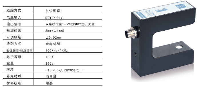 技術(shù)參數(shù) 1.支持模擬量/開關(guān)量輸出 2.適用于不透明、透明薄膜的追邊應(yīng)用 3.可見光對射 4.100k頻率載波編碼,不受環(huán)境光線影響 5.檢測范圍5mm,檢測精度0.02mm 6.高穩(wěn)定性,高精度