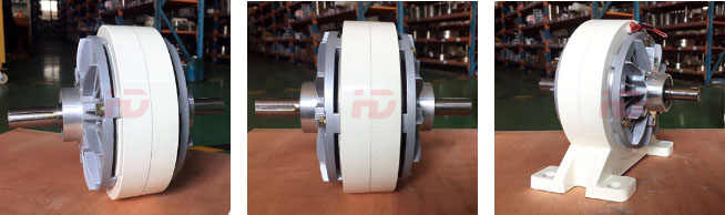 宏大ZKB型雙出軸磁粉離合器的驅動體(輸入端)和動體(輸出端)是在同心軸上的,兩者之間有磁隙并由軸支撐,可以自由旋轉。在磁隙中間填放有高導磁性的磁粉并在基外周配置了勵磁線圈,以便保證磁通通過。在無勵磁狀態下旋轉驅動體時,磁粉因離心力作用貼向驅動體工作面,驅動體與從動本不能連為一體。當線圈勵磁后,磁粉沿著所產生的磁通,有如鏈條一樣的形式連接起來,通過磁粉之間的連結力和磁粉與動作面的摩擦傳導扭矩。